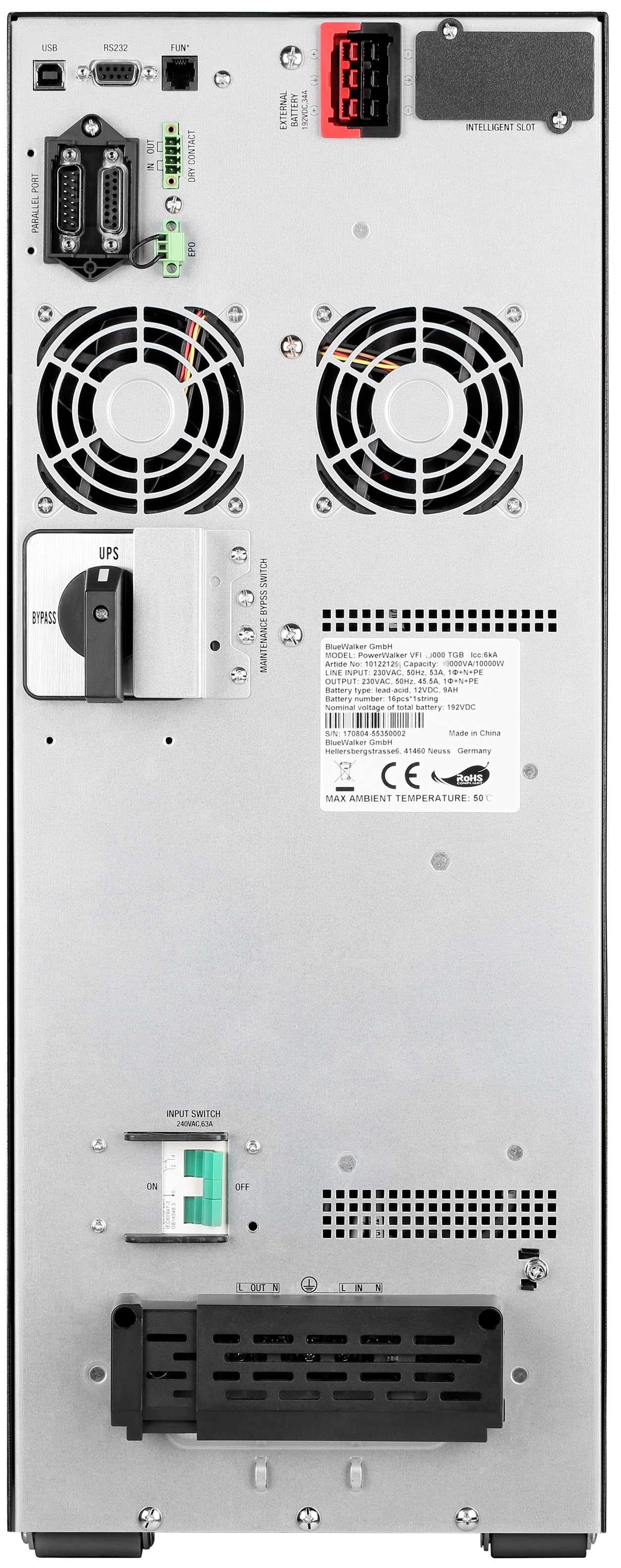 The PowerWalker VFI TG/TGB/TGS is a professional and versatile online UPS solution for almost all single-phase applications. The UPS is available in different versions: TG: with internal batteries for regular backup times TGB: with internal batteries and connection for external battery packs for extended autonomy times TGS: without internal batteries, but with a powerful charger for very long autonomy times